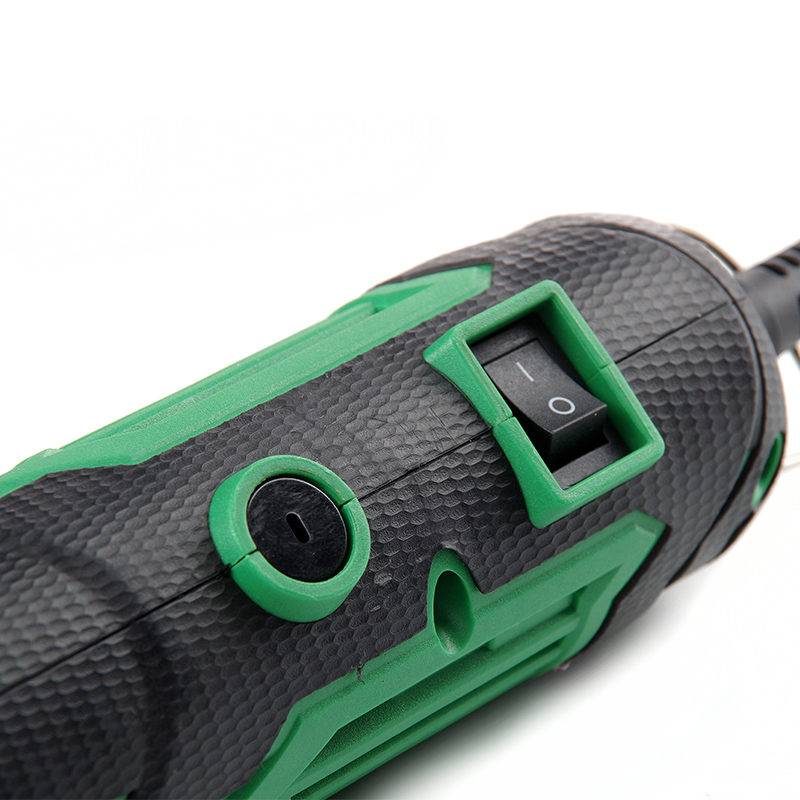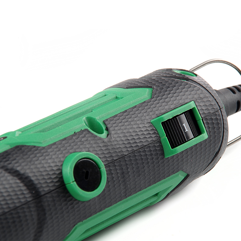 Щітковий двигун потужністю до 150 Вт забезпечує стабільну роботу навіть на високих обертах. Регулювання швидкості дає можливість точно контролювати процес обробки, що особливо важливо під час делікатних робіт з деревом, металом, пластиком чи склом. Гравер працює від стандартної мережі 230 В.