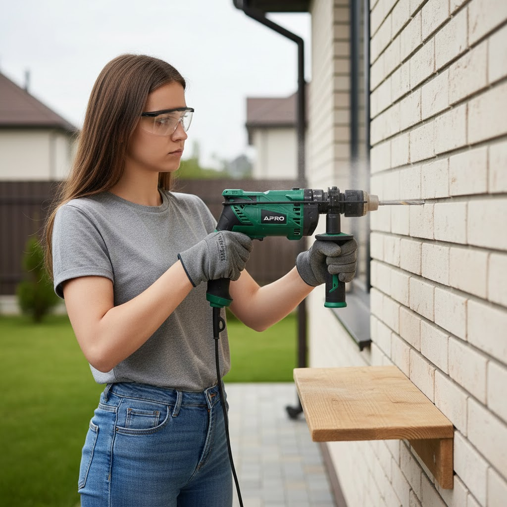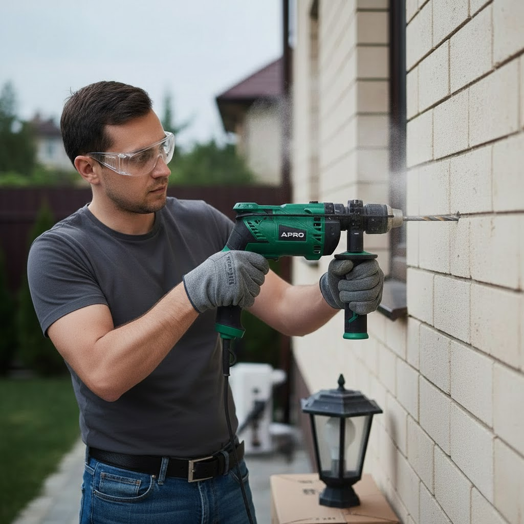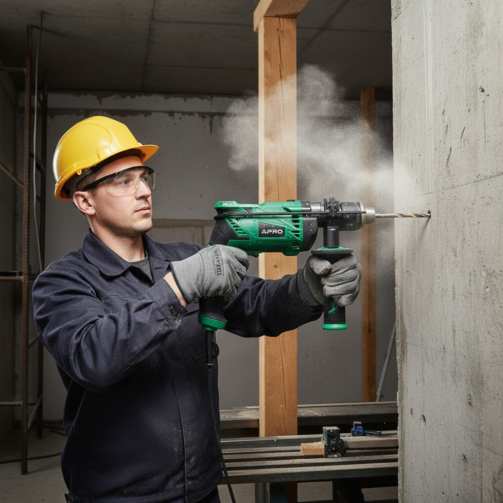 Ударная дрель APRO 13/900 оснащена щёточным двигателем с максимальной мощностью до 1100 Вт, что обеспечивает надёжную работу в широком спектре задач. Наличие ударного режима позволяет эффективно работать с твёрдыми материалами — от древесины до бетона. Регулировка оборотов делает инструмент универсальным для деликатного и интенсивного сверления.
