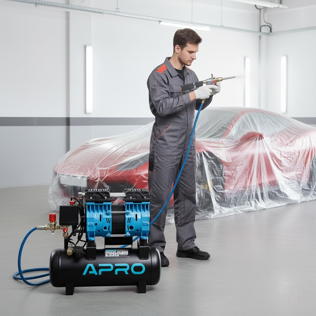 Компрессор оснащён ресивером объёмом 9 л, что делает его идеальным для работы с аэрографами и маломощными пневмоинструментами. Благодаря небольшому весу и компактным габаритам он удобен в хранении и транспортировке. Безмасляная конструкция позволяет получать высокую мощность при меньших размерах по сравнению с масляными аналогами.