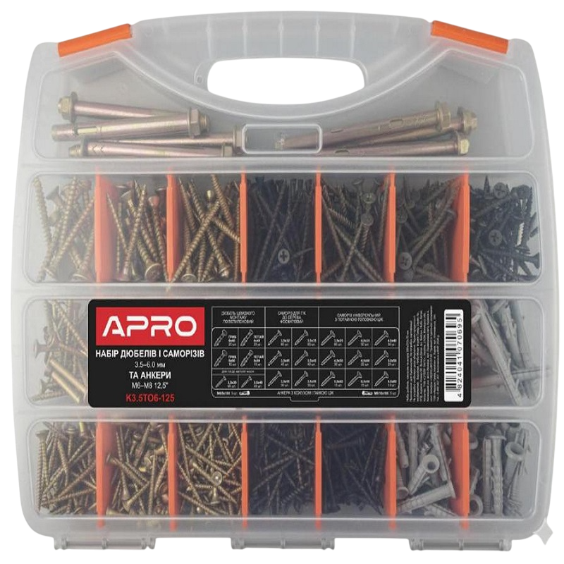 | Набор дюбелей и саморезов 3.5–6.0мм и анкеры M6–M8 12,5'' APRO | K3.5TO6-125 | 087708 | 3.5–6.0 мм | M6–M8 | Ассорти дюбелей, саморезов и анкеров в пластиковом кейсе | Пластиковые дюбели, стальные саморезы и анкеры | 320×250×50 | 2.2 | APRO | Монтаж в стенах и потолках, крепление конструкций, бытовые и профессиональные работы |