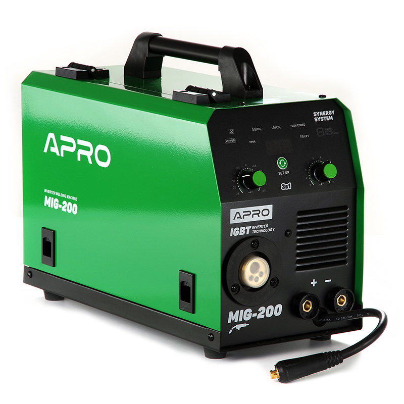 APRO MIG-200 – это инверторный сварочный полуавтомат, который сочетает высокую мощность, функциональность и надёжность. Благодаря поддержке режимов MMA, MIG, MAG и TIG Lift, он отлично подходит как для профессиональных, так и для бытовых сварочных работ. Диапазон сварочного тока от 20 до 200 А позволяет работать с электродами диаметром 1,6 – 4 мм и проволокой 0,6 – 1,0 мм, что делает устройство универсальным в использовании.